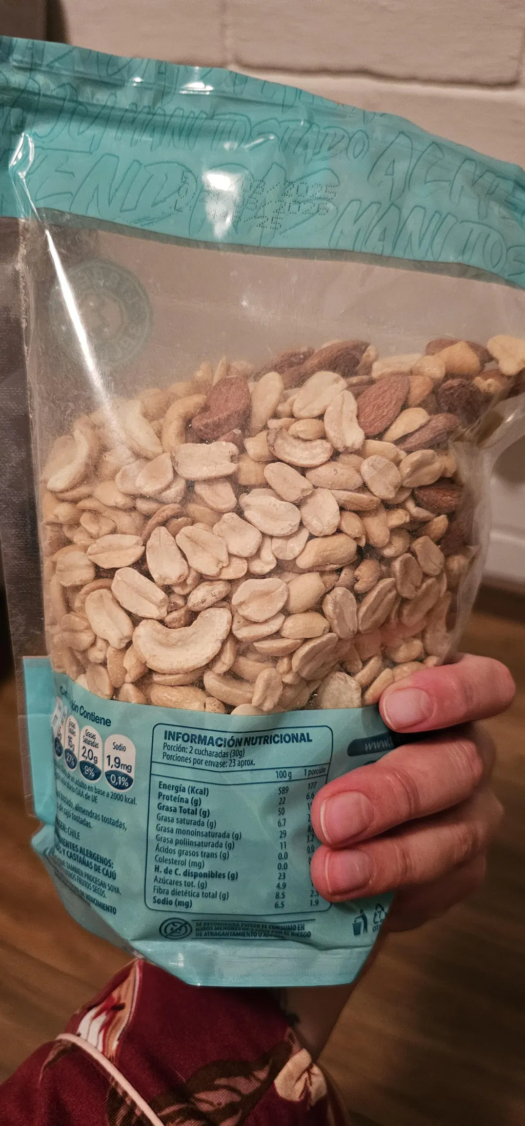 Ingredientes: Maní tostado, almendras tostadas, castañas de cajú tostadas.